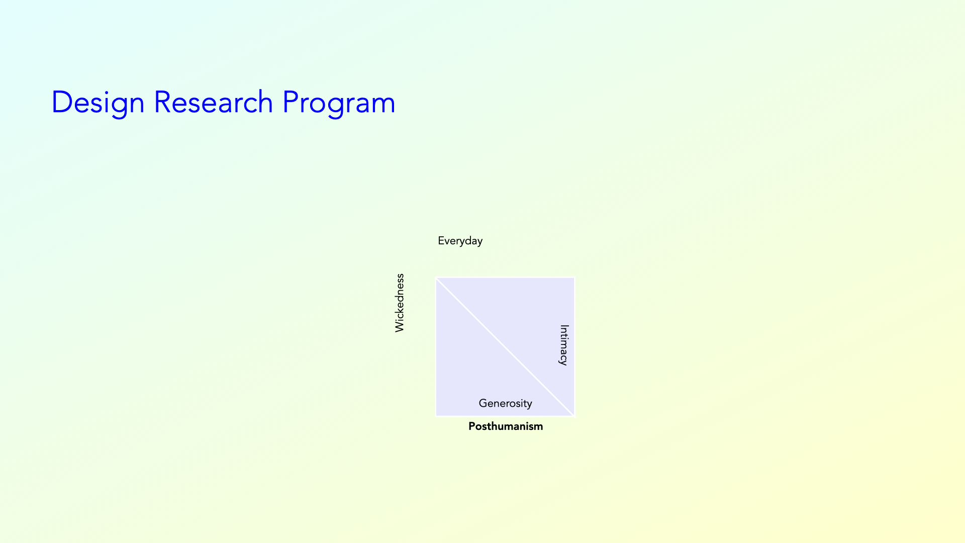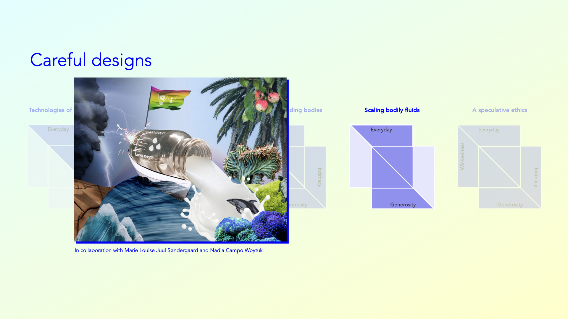 In this presentation, I will give a rather quick introduction of my research, and in particular a synthesis across my various projects and publications.Danah Abdulla refers to design otherwise as another way of thinking about creating change in the world that challenges established ways of doing design. For me, an oversimplification of this is rather than designing change, otherwise is about changing design. It recognizes that design is complicit in many structural systems of oppression and embedded with long-standing values, such as universality and objectivity, that exclude a diversity of human experiences.In my thesis, Interaction design refers to the design of experiences with digital materials, which I consider to be interactive or computational things that most often include data.I recognize an increasing material complexity of digital materials that makes it difficult for interaction designers to make sense of their reach and impact in the world, and how to intervene in this material complexity in a responsible way.I also recognize the role of digital materials in perpetuating social injustice and systemic inequality, through for example, discriminatory algorithms and toxic biases embedded within interactive systems and experiences.And in response, I draw upon more-than-human approaches that problematize familiar binaries and hierarchies, attend to nonhuman agencies, and think about being in the world as relational to consider how interaction design might be otherwise.I ground my inquiry into interaction design otherwise through two propositions: 1) Interaction design should wickedly attend to human everyday care; 2) Interaction design should intimately and generously question what it means to be human.The first situates everyday care as an important context for interaction design, and in which an ill-considered intervention or unintended consequence can be potentially revealing, shameful, or devastating. Wickedly attending recognizes care as wicked within its potential to make and unmake relations by orienting towards some care doings and not towards others.The second acknowledges that historically some humans have been considered more human than others, and others less than. So not questioning what it means to be human, risks ignoring a plurality of lives in everyday care. This questioning is inherently intimate within a socialmaterial engagement with the self, and a generous within the potential for vulnerability amid an opening and sharing of one’s self.These two propositions and the four axioms of everyday, wickedness, intimacy and generosity form the scaffolding of my research program designing with care.The theoretical underpinnings of everyday and wickedness are situated within a feminist ethic of care,And intimacy and generosity are situated in relation to posthumanism.This specification of these four axioms…...shifts from what Maria Puig de la Bellacasa calls thinking with care as an ontological overlap between care ethics and posthumanism, to my articulation of designing with care as an exploratory space to prototype what interaction design might be like within these conditions.I refer to the five prototypes discussed in this thesis as careful designs. Each explores the axioms of my program differently, through which they each make their own individual contributions.Technologies of human waste investigates the everyday care of bodily excretion through the design of speculative devices that predict when and how badly a person needs to urinate. These technologies position the associated data as intimate in relation to excretion being essential to a person’s somatic health and well-being.Spying on loved ones explores tensions in care at home through the critique of two autobiographical projects designed to monitor family members. It foregrounds a wickedness in care as not always “good”, positive, or fulfilling.Leaky breastfeeding bodies challenges cultural preconceptions of humans as individual and bounded through explorations within my breastfeeding relationship. These are intimate in relation to the everyday nurturing and nourishing of my child, and generous through a material and social sharing of myself.Scaling bodily fluids imagines everyday care as entangled in human and nonhuman collaborations through human bodily fluids. Though the design of four visual and textual narratives, it imagines a generosity in more-than-human worlds across uses and scales.A speculative ethics reflects upon social discomfort and material harm in relation to designing and researching with my own, shared milk through the creation of “performative texts.” The texts wickedly and generously speculate on ethical possibilities of an intimate engagement with the self.Before moving on, it is important to note that although the each axiom is drawn in the same proportions, their presence or absence within and across the careful designs is not even or binary.For example, a deeper dive into the projects shifts and rebalances the diagrams to be like so. This highlights how the research program allows for a variation of new ideas, while also searching for its limits of inclusion.In creating careful designs, my methodology is research-through-design. And I situate my methods within four broader approaches.Auto- design is a group of methods that explicitly engage with the human self as an open and mutable concept. This means that auto- design methods transform, or blur, boundaries between oneself, design, and other humans and nonhumans. This for example includes six months of tracking my own urinary routines.Spatial orientations describe how human and nonhuman bodies inhabit space. They draw attention to the social, material, and physical relations of people and things, and the messy realities of these relationships. This includes conceptualizing how care is directed across, around, through, or from spaces by technology.Leaky materials take into account the vitality of digital and non-digita